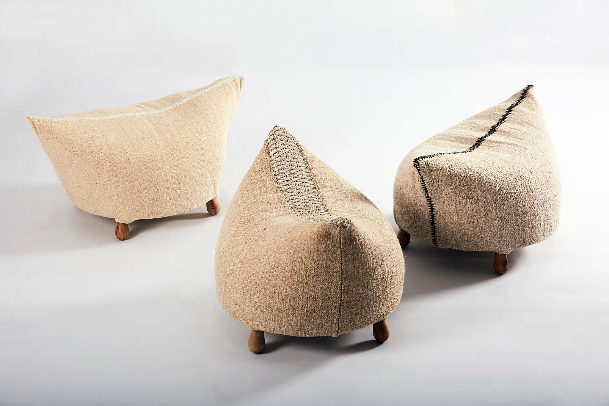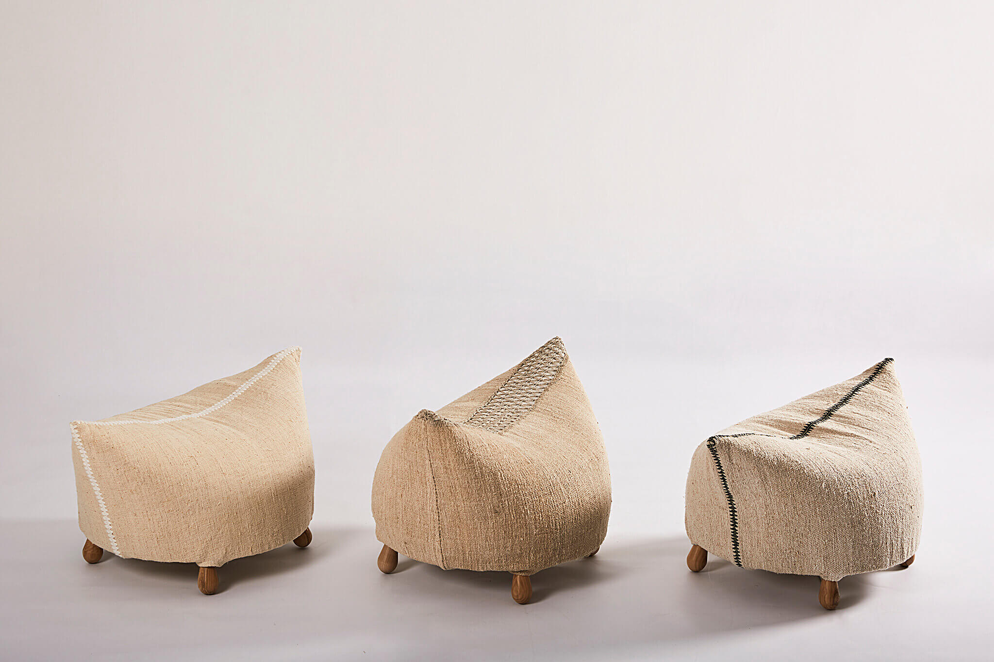 The littles poofs are part of the furniture collection Quintessence - a project inspired from Romanian and Moldovian traditional craftsmanship. Together with the designer Mihai Stamati, we set out to research and revalue the old production techniques in order to create a unique collection of furniture responsive to contemporary requisites. This project involved the collaboration with craftsmen and encouraged us to research the local materials and the stories behind them.