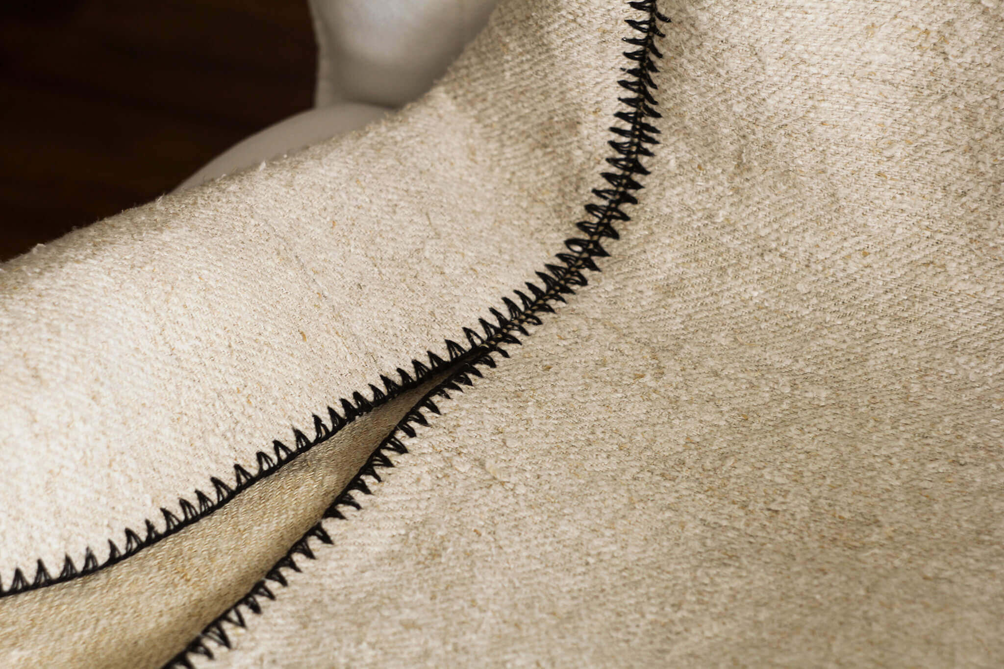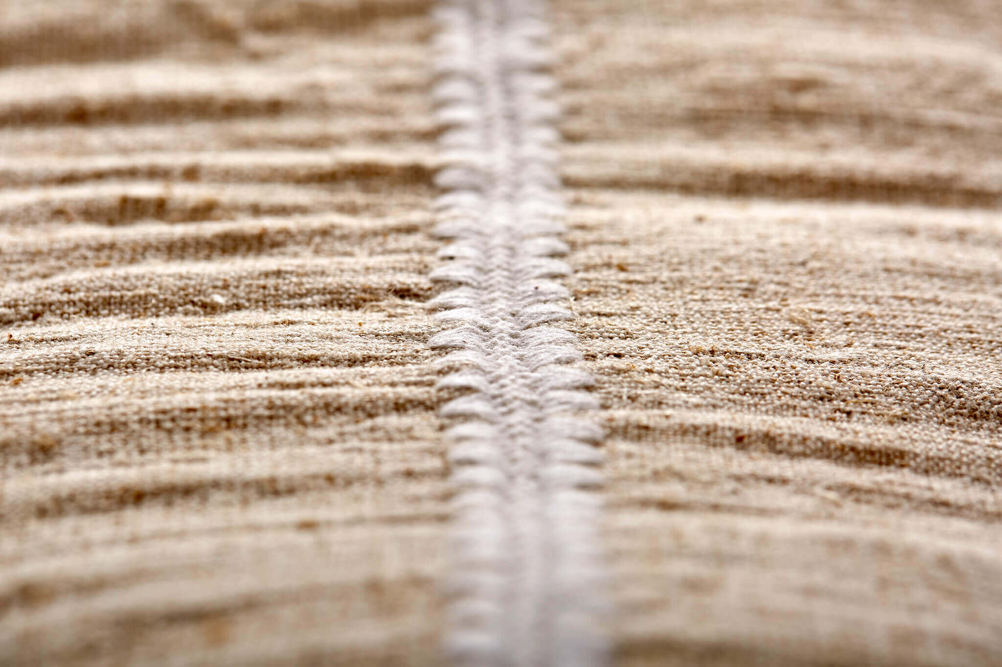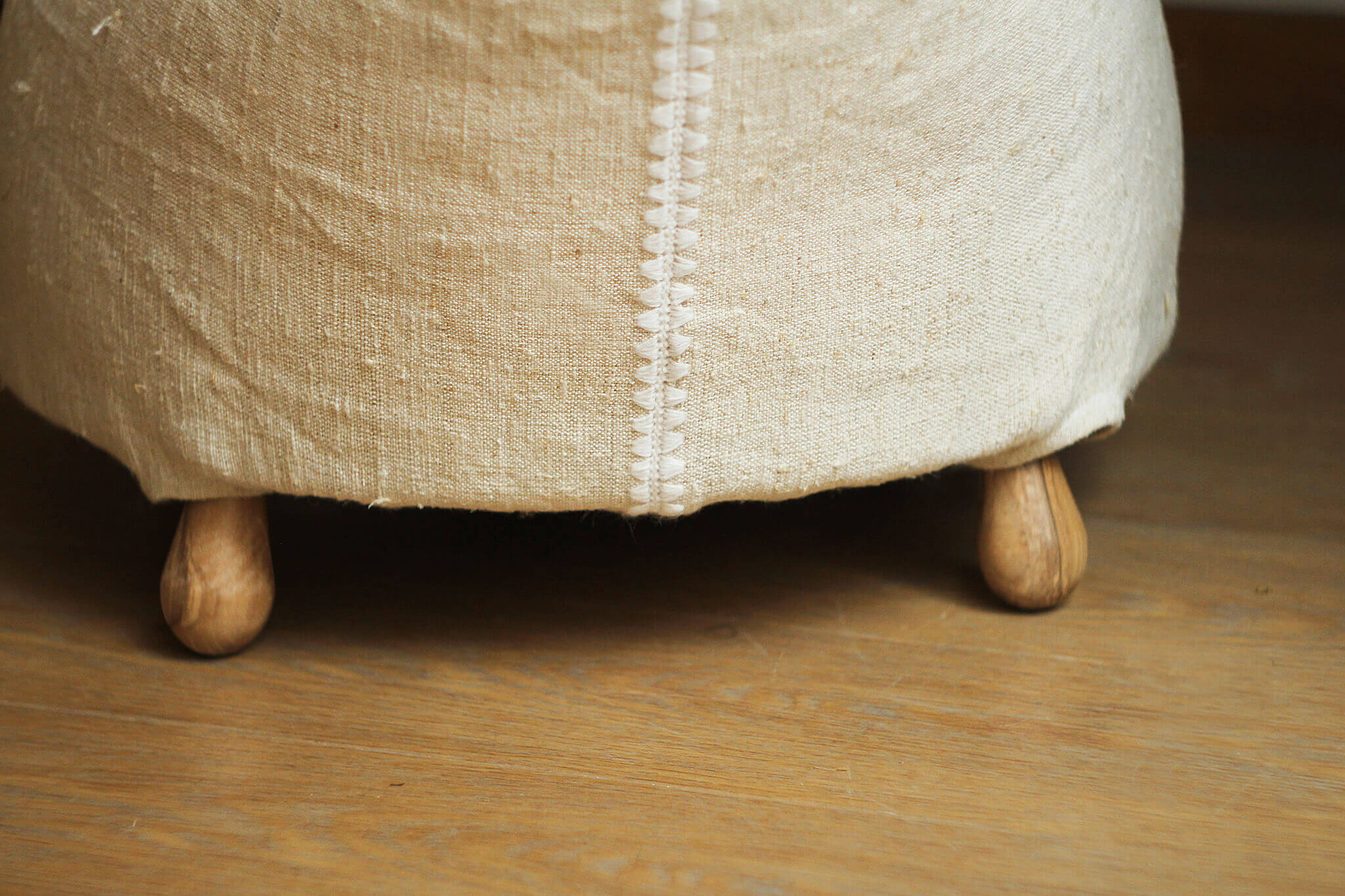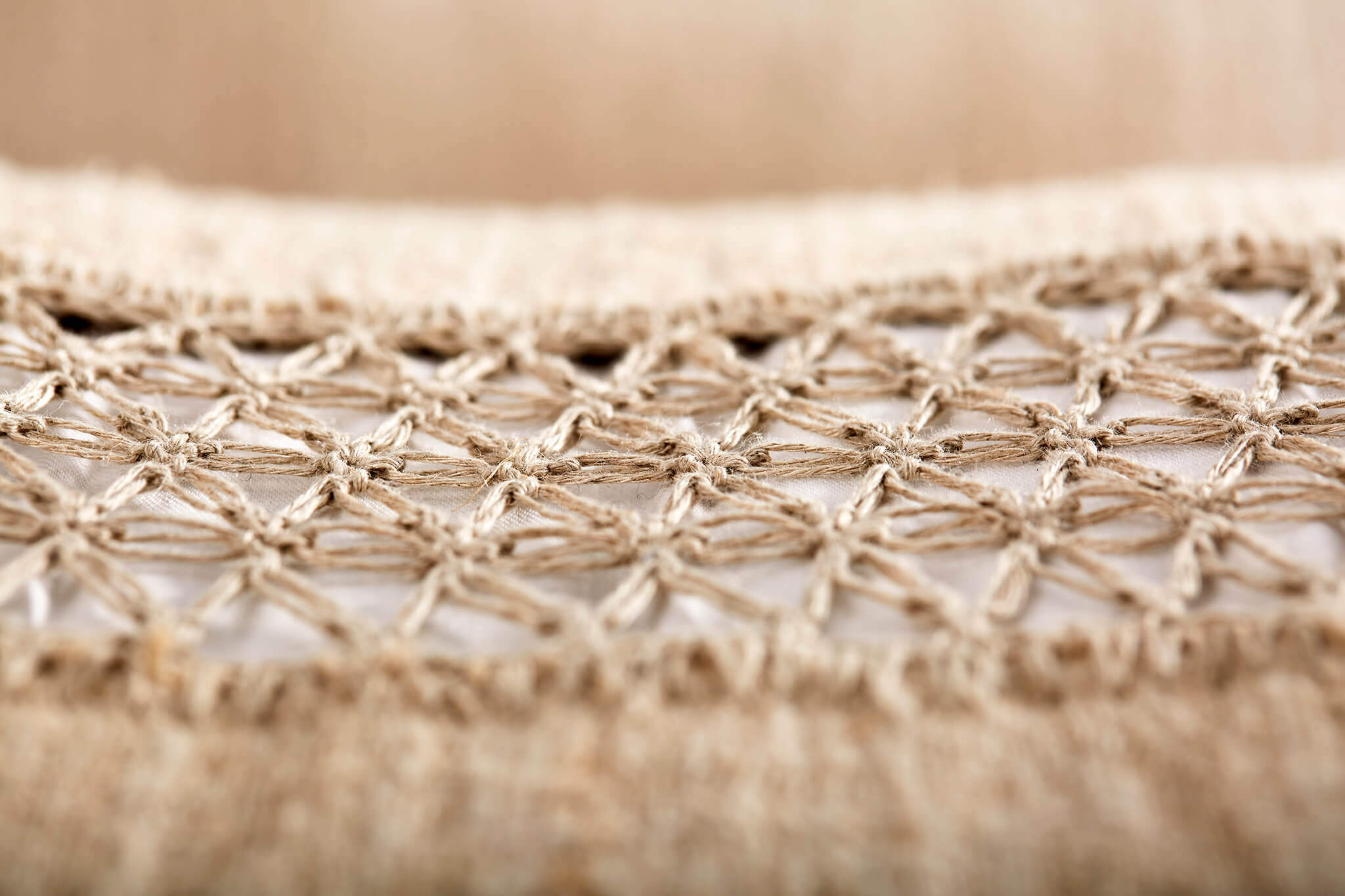 The poultry feathers, which were gathered and treated with care in traditional country houses, were used to fill cushions, mattresses, etc. This sustainable material forms the 'core' of the „Quintessence” poufs collection. The crocheted decorative ornament, which marks the seam between the two pieces of hemp textile, is inspired by the way craft textiles were attached: a seam between two textiles was another reason for decoration.
