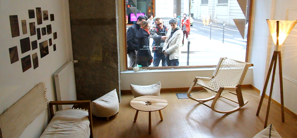Mobilierul creat de noi, ajuns în spaţiul vacant de pe Rue de la Republique, a adus cu sine mirosul de cânepă, de in, de lemn. Am recreat un living contemporan, cu un aspect scandinav, dar cu un iz de materie brută, lăsând să se vadă textura, neuniformitatea lucrului manual. Am rămas plăcut surprinşi de reacţia publicului francez. “Cela nous emporte ailleurs”- a fost replica memorabilă a unui vizitator.